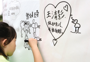 在猜鳥謎游戲結(jié)束后,參加活動(dòng)的大人和小朋友紛紛在愛鳥心愿墻上簽下自己的愛鳥護(hù)鳥寄語?!氨Wo(hù)鳥兒,從我做起!”王清影小朋友在寫下寄語的同時(shí),還認(rèn)真畫了一只小鳥,其他小朋友也紛紛寫下自己保護(hù)鳥類的愿景和寄語:“鳥類是我們的朋友!”“保護(hù)鳥類,人人有責(zé)?!薄氨Wo(hù)濕地,共同呵護(hù)鳥兒家園!”……