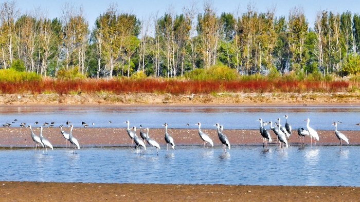 在山東黃河三角洲國家級自然保護(hù)區(qū)拍攝的白枕鶴(2022年10月18日攝)。