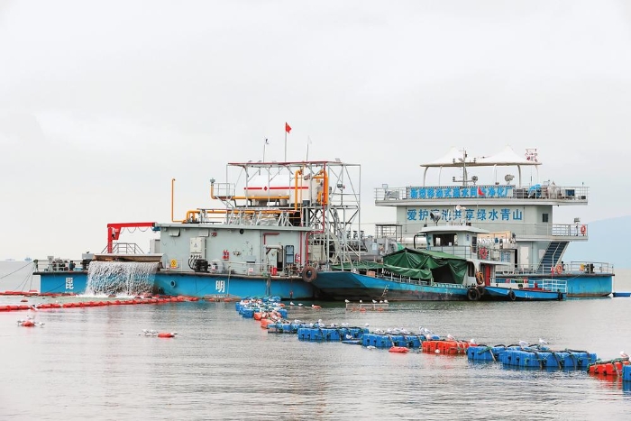 近年來,昆明市強化科技治理,做好滇池藍藻防控工作。截至今年8月底,累計收集處理富藻水2702.64萬立方米,處置藻泥12092噸,尾水原位回補滇池1618.45萬立方米。隨著滇池治理工作的不斷深入,滇池全湖水質(zhì)持續(xù)向好,連續(xù)5年保持Ⅳ類。圖為昆明滇池東碼頭附近水域?qū)嵤圃?、沖藻作業(yè)。